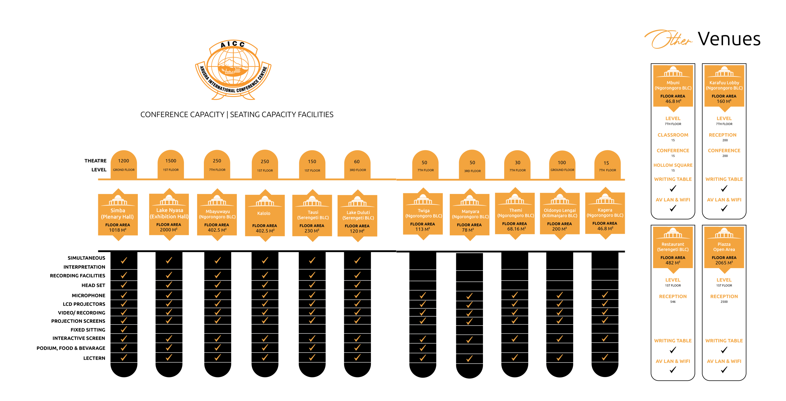 The Arusha International Conference Centre (AICC) is located in the heart of a touristic city of Arusha, a midpoint between Cape Town and Cairo and a stone’s throw from Africa’s greatest Mountains, Mount Meru and Kilimanjaro. Arusha is also a safari-gateway to the astounding wild life sanctuary the likes of Ngorongoro Crater, the serene of Serengeti National Park, Tarangire and Lake Manyara National Parks.